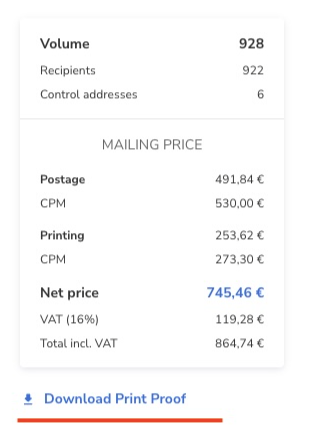 - When the mailing status changes from 'Preparing for Print' to 'Print Approval Required,' a 'Download Print Proof' button will appear below the Mailing Price. You can use this button to download the proof for review.